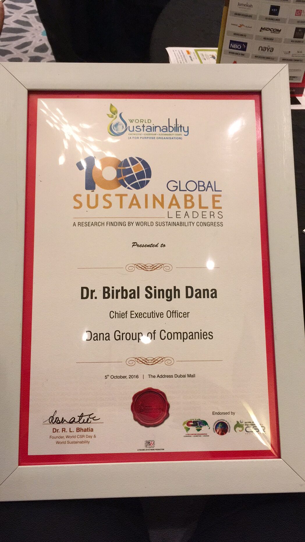 October 2016 :- Dr Birbal Singh Dana Recognized Amongst Top Leaders at the World Sustainability Forum